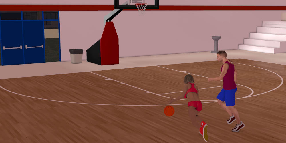 Anne: He's surprised when I start dribbling the ball and get past his weak defense to get down the court. I'm watching him and he starts to guard me better. I make a break for the basket and when I see he's in mid stride I put on the brakes.