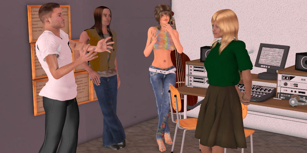 Anne: Johnny is a musician and he has long brown hair and wears sort of hippy clothes. Darla is a free spirit too and it is surprising to learn that Riley and Johnny have been best friends for years, they seem so different. Johnny and Darla are so open and friendly.